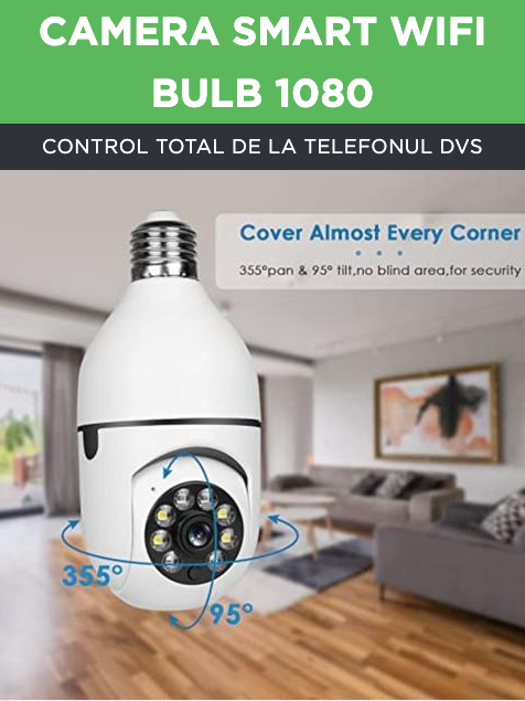 CAMERA SMART WIFI BULB 1080 Camera 1080p este o cameră wireless de înaltă tehnologie controlată de pe un smartphone, tabletă sau laptop. Datorită acestuia, puteți vedea și auzi pe smartphone-ul sau laptopul dvs. ceea ce se întâmplă în casa, biroul sau casa dvs. Puteți roti camera în sus-jos, stânga-dreapta la 355 de grade. Astfel, veți obține o imagine de ansamblu completă și un control asupra teritoriului dvs.