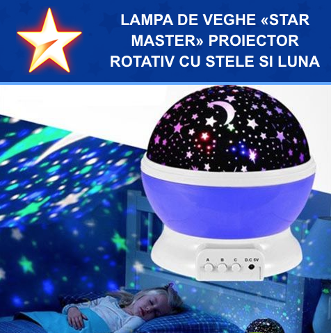 LAMPA DE VEGHE «STAR MASTER» PROIECTOR ROTATIV CU STELE SI LUNA Proiector rotund rotativ cu lumină de noapte, cer înstelat, Star Master este un cadou grozav pentru copilul dumneavoastră. Acesta va ilumina camera bebelușului dvs. cu stele frumoase și cu luna. Lampa de noapte este un proiector al cerului înstelat - este capabil să transforme fantastic interiorul camerei dvs. pe timp de noapte.